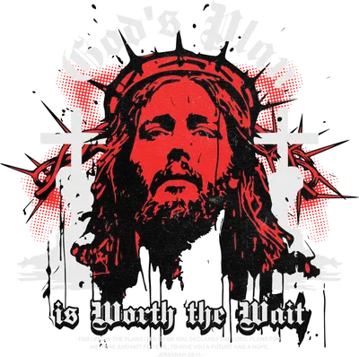 Dive into powerful faith expression with this striking "God's Plan is Worth the Wait" DTF transfer. Featuring a bold, stoic depiction of Jesus wearing a crown of thorns, framed by two symbolic crosses, this design combines spiritual depth with an edgy, modern aesthetic. The red, black, and white color palette, accented with halftone dots and gritty splatters, creates a visually impactful look. Below the main imagery, the full verse from Jeremiah 29:11 reinforces the message of hope and divine purpose. This ready to press design is perfect for those seeking to make a strong statement of their Christian belief. This impactful design is an ideal iron on transfer for individuals who carry their faith with conviction, youth groups looking for inspiring apparel, or small businesses specializing in Christian streetwear. It’s perfect for personal expression, thoughtful gifts for confirmation or spiritual milestones, or creating custom heat transfer designs for church events and retreats. Showcase your devotion and share the powerful message of God's unwavering plan with this unique heat press design, suitable for all who find strength in their spiritual journey. Applying this heat press transfer is incredibly simple. It adheres beautifully to a wide range of fabrics, including cotton, polyester, cotton-poly blends, and even nylon. Achieve professional results using a heat press (recommended at 300-325°F for 15 seconds with medium pressure) or a household iron. Say goodbye to tedious weeding – simply peel and press! This versatile design is perfect for custom t-shirts, hoodies, sweatshirts, tote bags, pillow covers, and denim jackets, allowing you to personalize almost any textile. For lasting durability, wash garments inside out and tumble dry on low. Experience superior quality with every print. This ready to press transfer boasts vibrant, full-color printing with exceptional fine detail, ensuring your design stands out. It’s crack-resistant and soft to the touch, avoiding the stiff, heavy feel often associated with traditional vinyl transfers. Each direct to film transfer is meticulously printed on premium DTF film, engineered with a strong adhesive backing for consistent, professional application and a durable finish that will withstand countless wears and washes.