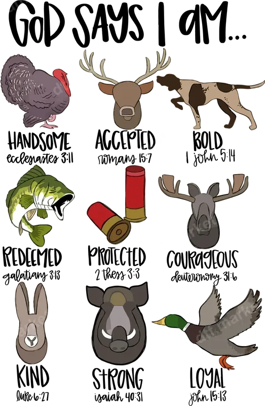 See allThis unique "God Says I Am" DTF transfer combines powerful scripture affirmations with classic hunting and wildlife imagery. Featuring illustrations of a turkey, deer, hunting dog, bass, moose, rabbit, wild boar, duck, and shotgun shells, each paired with a word like "Handsome," "Accepted," or "Strong" and its corresponding Bible verse. This ready to press design is perfect for those who connect their faith with the great outdoors. This inspiring "heat transfer" is ideal for hunters, outdoorsmen, Christian men, and anyone who cherishes both their faith and the wilderness. It makes a thoughtful gift for dads, brothers, sons, or friends on occasions like Father's Day, hunting season, or birthdays. Create custom apparel that inspires and reflects a strong, grounded spirit. Applying this vivid "iron on transfer" is incredibly simple. Designed for seamless use with a heat press at 300-325°F for 15 seconds with medium pressure, it also works wonderfully with a household iron. Forget the hassle of weeding; this "t-shirt transfer" is delivered ready for immediate application onto cotton, polyester, and various fabric blends. Experience professional-grade quality with this DTF transfer. Our transfers boast vibrant colors, excellent wash durability, and resistance to cracking, ensuring your custom garments look fantastic for a long time. The soft-touch finish and strong adhesive provide a premium feel, making this "apparel transfer" a superior choice for personalizing clothing and accessories.
