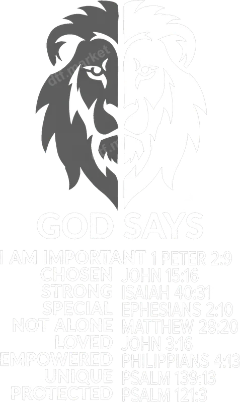 See allThis inspiring DTF transfer showcases a striking split-face lion design, half solid and half outline, symbolizing strength and unwavering faith. Below, "GOD SAYS" introduces powerful affirmations like "I AM IMPORTANT," "CHOSEN," "STRONG," and "LOVED," each paired with its empowering Bible verse. This ready to press design beautifully communicates divine self-worth and spiritual resilience. This Christian heat press design is ideal for expressing faith or sharing uplifting messages. Perfect for church groups, youth ministries, bible study members, or individuals seeking daily spiritual reminders. Great for personalizing apparel for retreats, mission trips, religious holidays, or as an encouraging gift for birthdays, confirmations, or baptisms. Applying this iron on transfer is simple and efficient. Our direct to film transfers adhere to 100% cotton, polyester, and all blends. For optimal results, use a heat press at 300-325°F for 15 seconds with medium pressure, then peel cold. A household iron also works well. Enjoy a professional finish without tedious weeding typically associated with vinyl. Crafted with premium DTF film and inks, this apparel transfer ensures vibrant colors and durability. The design is crack-resistant, peel-resistant, and soft to the touch, integrating seamlessly with your garment. Strong adhesive guarantees a long-lasting, high-quality finish, maintaining integrity wash after wash.