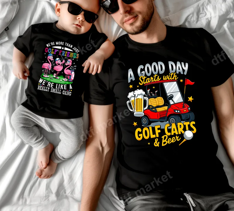 See allGet ready to hit the links in style with this humorous 'A Good Day Starts with Golf Carts & Beer' DTF transfer. This vibrant heat press design features a classic red golf cart, a frothy mug of beer, and a pristine golf ball, all set against a backdrop of twinkling stars. It's a perfect ready to press design for anyone who knows the true priorities of a relaxing day on the green. This versatile iron on transfer is ideal for the golf enthusiast, the beer connoisseur, or anyone who appreciates a good laugh. It makes an excellent gift for Father's Day, birthdays, golf trip souvenirs, or simply to add some fun to your casual wardrobe. Perfect for dads, grandpas, uncles, or any friend who loves a round of golf followed by a refreshing brew. Applying this high-quality heat press design is a breeze. Our durable t-shirt transfer works seamlessly on a wide range of fabrics, including cotton, polyester, and their blends. Simply use a heat press at 300-325°F for 15 seconds with medium pressure, or apply with a household iron. Best of all, there's absolutely no weeding required, making custom apparel creation quick and effortless. Crafted using premium DTF film, this professional-grade apparel transfer boasts incredibly vibrant colors and a soft, smooth finish that feels great to the touch. It's designed for exceptional durability, resisting cracks and peels even after multiple washes, ensuring your personalized garments look fantastic for years to come. Experience professional results with every direct to film transfer application.
