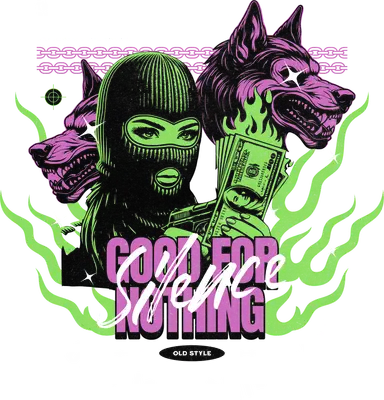 Embrace a bold, rebellious statement with this striking DTF transfer featuring an enigmatic figure in a black balaclava, her piercing green eyes exuding defiance. Clutching a wad of cash and a pistol, she is flanked by two snarling, magenta-hued dogs with glowing eyes, all set against a vibrant backdrop of neon green flames and linked chains. The powerful text "GOOD FOR NOTHING" underscores the design's unapologetic attitude, making this an essential ready to press graphic for those who dare to stand out. This fierce design is perfect for streetwear enthusiasts, hip-hop fashion lovers, urban artists, and anyone with a bold, unconventional style. It makes an excellent iron on transfer for creating unique apparel for concerts, festivals, urban events, or as a statement piece in your everyday wardrobe. Small apparel businesses and crafters looking to offer edgy, high-impact designs will find this heat transfer design an immediate hit, allowing them to cater to a niche market with authentic style. Applying this heat press transfer is incredibly easy. It adheres flawlessly to cotton, polyester, cotton-poly blends, and even nylon fabrics. Simply use a heat press at 300-325°F for 15 seconds with medium pressure, or apply with a household iron. There's no tedious weeding required—just peel and press for instant, professional results. Transform custom t-shirts, hoodies, sweatshirts, tote bags, pillow covers, and denim jackets into unique fashion statements. For lasting durability, wash garments inside out and tumble dry on low heat. Experience superior quality with this ready to press transfer. It boasts vibrant, full-color printing with exceptional fine detail, ensuring every element of the edgy artwork pops. The transfer is crack-resistant and soft to the touch, avoiding the heavy, stiff feel often associated with vinyl transfers. Each direct to film transfer is printed on premium DTF film with a strong, reliable adhesive backing, guaranteeing a smooth application and professional finish every single time.