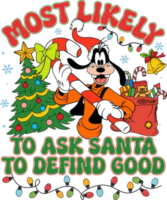 See allThis festive and funny DTF transfer features everyone's favorite lovable character, Goofy, surrounded by classic Christmas elements like a decorated tree, candy cane, presents, and twinkling lights. The design playfully proclaims, "MOST LIKELY TO ASK SANTA TO DEFINE GOOD," capturing a whimsical and slightly mischievous holiday spirit. This vibrant, full-color graphic is a perfect ready to press transfer to add a touch of unique humor to your seasonal apparel. This charming design is perfect for Disney enthusiasts, families creating matching holiday outfits, or anyone who enjoys a good laugh during the festive season. It's an ideal iron on transfer for Christmas parties, family gatherings, or as a fun gift for friends and loved ones. Small t-shirt businesses and crafters looking for popular heat transfer designs will find this a fantastic addition to their holiday inventory, appealing to customers seeking unique and amusing Christmas wear. Applying this premium heat press transfer is a breeze, whether you use a professional heat press (recommended: 300-325°F for 15 seconds, medium pressure) or a household iron. Our DTF transfers adhere beautifully to a wide range of materials, including cotton, polyester, cotton-poly blends, and even nylon. Skip the tedious weeding; simply peel and press! It's perfect for creating custom t-shirts, cozy hoodies, festive sweatshirts, unique tote bags, or even holiday-themed pillow covers and baby onesies. For best results, wash garments inside out and tumble dry low. Experience superior quality with this ready to press transfer, boasting vibrant colors and intricate details that truly pop. The design is crack-resistant and soft to the touch, ensuring comfort without the heavy feel of traditional vinyl. Each direct to film transfer is expertly printed on premium DTF film with a robust adhesive backing, guaranteeing a professional and long-lasting finish that will brighten any garment for many holidays to come.