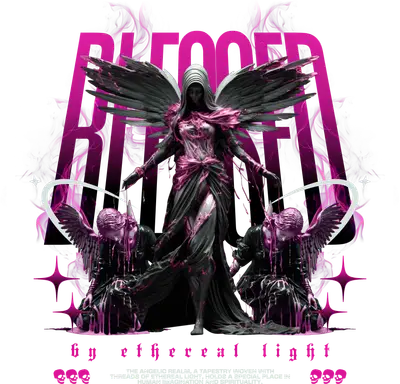 Embrace the captivating mystique of our Blessed Gothic Angel DTF transfer, a truly unique design that blends dark fantasy with modern streetwear aesthetics. This striking graphic features a dominant hooded angelic figure with expansive wings, flanked by two kneeling celestial beings, all rendered in a grayscale palette dramatically accented with vibrant fuchsia splashes and drips. The powerful word "BLESSED" looms large in the background, overlaid with subtle, smoky fuchsia wisps, while "by ethereal light" completes the evocative message below. This ready to press design is a statement piece for anyone drawn to the edgy and spiritual. This dramatic iron on transfer is perfect for individuals who champion alternative fashion, gothic styles, or streetwear culture. It's an ideal heat transfer design for creating custom apparel for concerts, music festivals, or simply to express a bold personal style. Small businesses specializing in unique clothing, Etsy sellers, or crafters looking to offer distinctive designs will find this transfer invaluable. Give it as a memorable gift to a friend who appreciates dark fantasy art or edgy spiritual themes, or use it to craft a standout piece for yourself. Applying this heat press transfer is a breeze, compatible with a wide range of fabrics including cotton, polyester, cotton-poly blends, and even nylon. Achieve professional results using a heat press set at 300-325°F for 15 seconds with medium pressure, or easily apply it with a household iron. There's no tedious weeding required—simply peel and press! Perfect for custom t-shirts, hoodies, sweatshirts, tote bags, pillow covers, baby onesies, aprons, and denim jackets. For lasting durability, wash garments inside out and tumble dry on low heat. Our ready to press transfer boasts exceptional quality with vibrant, full-color printing and intricate details that truly bring the design to life. It’s engineered to be crack-resistant and feels soft to the touch, without the heavy, stiff feel often associated with vinyl transfers. Each direct to film transfer is printed on premium DTF film with a robust adhesive backing, ensuring a smooth application and a professional finish every time. Step up your apparel game with this compelling gothic angel design.