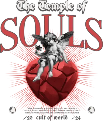 This striking DTF transfer features a classical grayscale cherub perched thoughtfully atop a dramatically fractured red heart, emanating with radiant lines. Above, the bold gothic script declares 'The Temple of SOULS,' creating an aura of dark romance and profound reflection. The design merges timeless artistry with a modern, edgy aesthetic, perfect for those who appreciate unique, thought-provoking apparel. This ready to press design brings a rich, intricate visual story to any garment. This captivating design is an ideal iron on transfer for individuals drawn to gothic aesthetics, dark academia, streetwear fashion, or those with an appreciation for classical art with a modern twist. It's perfect for creating unique custom t-shirts for art enthusiasts, philosophical minds, or anyone wanting to express a deeper, more artistic side. Ideal for personal expression, gifts for friends who love edgy styles, or as inventory for small boutique owners and Etsy sellers specializing in alternative fashion. This heat transfer design stands out. Applying this heat press transfer is simple and efficient, making it perfect for both experienced crafters and beginners. It adheres beautifully to a wide range of materials including cotton, polyester, cotton-poly blends, and even nylon. Achieve professional results with a heat press set at 300-325°F for 15 seconds with medium pressure, or use a household iron with care. There's no tedious weeding required – just peel and press! Use this versatile apparel transfer to customize hoodies, sweatshirts, tote bags, pillow covers, and denim jackets. For best longevity, wash garments inside out and tumble dry on low heat. Experience exceptional quality with this ready to press transfer. It boasts vibrant, full-color printing that captures every fine detail, from the cherub's delicate features to the subtle fractures in the heart. The design is crack-resistant and features a soft hand feel, avoiding the heavy, stiff sensation often associated with vinyl transfers. Each direct to film transfer is meticulously printed on premium DTF film, ensuring a strong, durable adhesive backing that guarantees professional, long-lasting results with every application.