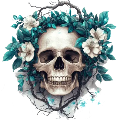Gothic Floral Skull DTF Transfer | Teal Leaves & White Flowers