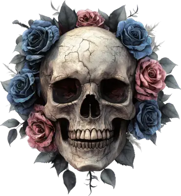 Gothic Skull with Blue & Pink Roses DTF Transfer