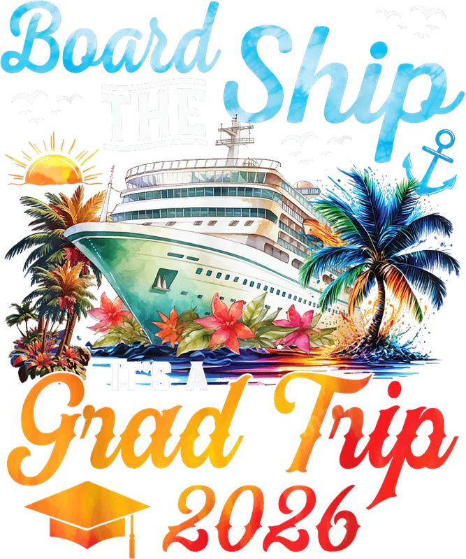 See allCelebrate your milestone with this vibrant 'Board The Ship It's A Grad Trip 2026' DTF transfer. This captivating design showcases a majestic cruise ship amidst tropical palm trees, colorful hibiscus, and a beautiful sunset, complete with a graduation cap. It's a perfect ready to press design, capturing the excitement of a post-graduation getaway and making ideal custom apparel for your graduating class or senior trip. This unique heat press transfer is designed for the Class of 2026, perfect for graduating seniors, friends, and family commemorating this milestone. Create custom shirts for senior trips, graduation parties, family vacations, or as a thoughtful gift. Imagine matching tees for a cruise or beach resort – endless possibilities for celebrating a well-deserved break. Applying this direct to film transfer is incredibly easy, ensuring a professional finish. Our premium heat press ready design works on cotton, polyester, and blends. For best results, use a heat press at 300-325°F for 15 seconds with medium pressure, then cold peel. A household iron can also be used. Forget weeding; simply press and enjoy your new custom t-shirt transfer. Experience superior quality with our DTF transfers. This durable shirt design boasts incredibly vibrant, crack-resistant colors and a soft feel, integrating smoothly with the fabric. Crafted from professional-grade DTF film with strong, long-lasting adhesive, this apparel transfer ensures your memories of the Grad Trip 2026 will last for years to come, wash after wash.