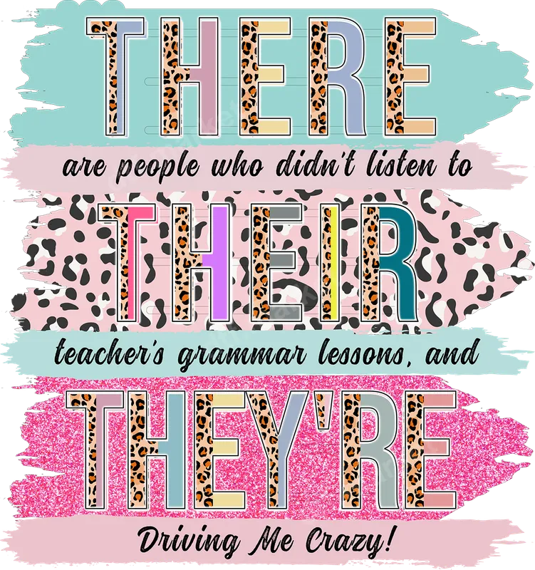See allUnleash your inner grammar enthusiast (or exasperated educator!) with this witty DTF transfer. Featuring the commonly confused 'THERE, THEIR, THEY'RE' in a vibrant, sassy design, this graphic perfectly captures the frustration of grammar lessons gone awry. Adorned with playful leopard print and sparkly pink glitter accents over distressed pastel backgrounds, this ready to press design is sure to spark smiles and knowing nods from fellow language lovers. It’s a stylish and humorous statement for anyone who appreciates correct English. This fun heat press design is ideal for educators, students, writers, editors, or anyone who secretly (or not-so-secretly) judges grammar mistakes. It makes a fantastic gift for Teacher Appreciation Day, a unique back-to-school statement, or a humorous present for the grammar police in your life. Imagine this witty design on a custom t-shirt for English class, a tote bag for library visits, or a cozy sweatshirt for grading papers. Applying this apparel transfer is a breeze for both beginners and experienced crafters. Simply use a heat press set to 300-325°F for 15 seconds with medium pressure for a professional finish. For those without a heat press, a household iron can also be used with careful application. Unlike traditional vinyl, there's absolutely no weeding required, making this an incredibly quick and easy iron on decal for your projects. Just press and peel! Crafted with professional-grade DTF film, this t-shirt transfer ensures brilliant colors that pop and sharp details that last. Our transfers are incredibly durable, offering excellent washability and resistance to cracking or fading, so your grammar statement stays strong. The soft-touch feel integrates seamlessly into any fabric, providing a comfortable wear. Experience the superior quality of a premium DTF transfer, designed to make your garments truly stand out.