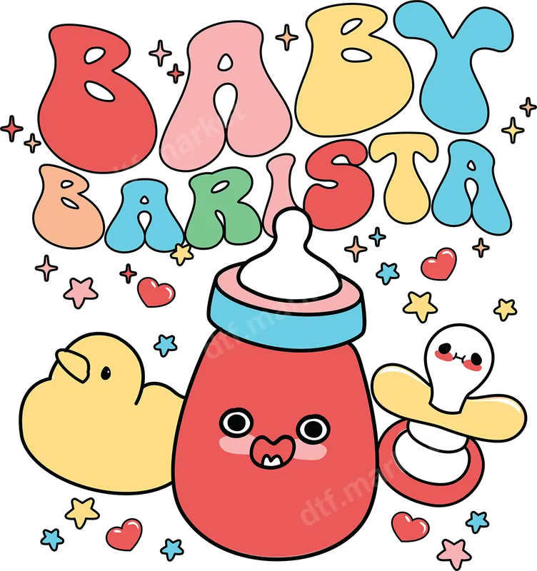 See allThis vibrant "Baby Barista" DTF transfer features a playful retro font in pastel shades, surrounded by twinkling stars and sweet hearts. The design includes an irresistibly cute baby bottle and pacifier, each with charming smiley faces, alongside a delightful rubber duck. This ready to press design perfectly captures a whimsical and adorable vibe, ideal for celebrating the newest little coffee-lover in your life. It's a fun and unique direct to film transfer for any project. This delightful heat press design is perfect for new parents, grandmas, coffee enthusiasts, or anyone attending a baby shower or gender reveal party. It makes an exceptional gift for a newborn, an older sibling's "big sister/brother" announcement, or even for creating custom matching family outfits. Imagine this charming iron on decal on a onesie for a photoshoot or a personalized toddler shirt for a coffee shop visit. Applying your new t-shirt transfer is a breeze, whether you use a professional heat press or a household iron. Our versatile apparel transfer adheres flawlessly to a wide range of fabrics, including 100% cotton, 100% polyester, and various cotton/poly blends. For best results with a heat press, apply at 300-325°F for 15 seconds with medium pressure. Then, simply peel cool. There's no tedious weeding required, making your crafting process quick and enjoyable. Experience superior quality with our premium DTF transfers. Each heat transfer design boasts incredibly vibrant colors that pop, along with exceptional crack resistance, ensuring your design looks fantastic wash after wash. The finished transfer is soft to the touch, providing maximum comfort for garments. We use professional-grade DTF film and strong adhesive, guaranteeing a durable and long-lasting finish for all your custom transfer projects.