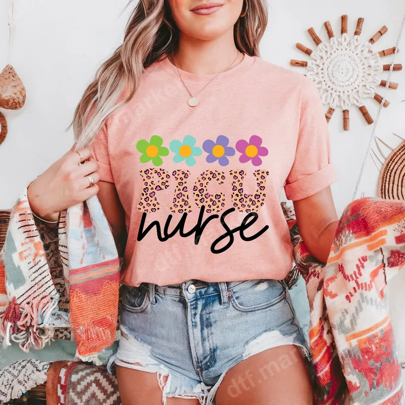 See allThis vibrant "Peace Nurse" DTF transfer combines retro charm with a heartfelt message. The word "Peace" features a trendy leopard print pattern accented with subtle pink hearts, crowned by three cheerful, colorful daisy-like flowers. Below, "nurse" is elegantly scripted, creating a stylish and appreciative design. This unique DTF transfer is an excellent way to celebrate the dedication of healthcare professionals with a touch of groovy flair. It arrives ready to press, making customization simple and fun. This eye-catching design is perfect for nurses, nursing students, medical professionals, and anyone who wants to show their support for healthcare heroes. It's an ideal choice for Nurse Appreciation Week, graduation gifts, birthdays, or just as a thoughtful gesture for a beloved nurse. Create custom t-shirts, tote bags, and more for your team, friends, or family members in the medical field. Applying this high-quality heat transfer is straightforward and efficient. Our direct to film transfers adhere beautifully to 100% cotton, 100% polyester, and various cotton/poly blends. For best results, use a heat press at 300-325°F for 15 seconds with medium pressure, followed by a cold peel. While a heat press is recommended, a household iron can also be used. There's no weeding required, saving you time and effort on your apparel transfer projects. Crafted with premium DTF film and strong adhesive, this iron on transfer ensures a durable and professional finish. The colors are incredibly vibrant, resistant to cracking and fading, and the final print offers a soft, smooth feel on the garment. Enjoy long-lasting wear and exceptional detail that will make your customized clothing stand out.