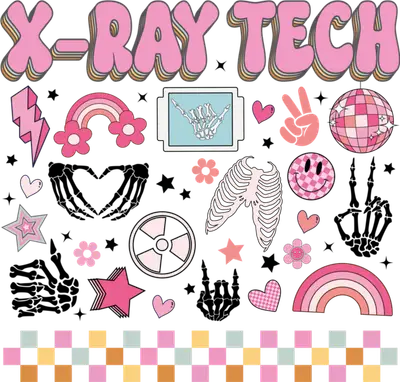 See allEmbrace your inner radiologic technologist with this super groovy "X-RAY TECH" DTF transfer, bursting with retro charm and playful medical flair. Featuring a delightful mix of pink, peach, light blue, and pastel hues, this design includes stylized skeleton hands making peace signs, heart shapes, and shakas, alongside a cute rib cage, disco ball, rainbows, and a rad checkered smiley face. It's a vibrant, ready to press design that perfectly blends professional pride with a fun, vintage aesthetic. This unique design is perfect for X-Ray Techs, radiology students, medical professionals, and anyone who appreciates a fun twist on healthcare themes. It makes an excellent appreciation gift for colleagues, a thoughtful graduation present, or a fantastic way for small t-shirt businesses and crafters to create custom apparel. Whether you're making a statement at work or gifting a friend, this eye-catching iron on transfer is sure to bring smiles and positive vibes. Applying this heat press transfer is a breeze on cotton, polyester, cotton-poly blends, and even nylon fabrics. Simply use a heat press at 300-325°F for 15 seconds with medium pressure, or apply with a household iron following similar guidelines. Forget weeding; these designs are ready to press directly onto custom t-shirts, hoodies, sweatshirts, tote bags, pillow covers, baby onesies, and denim jackets. For lasting durability, wash garments inside out and tumble dry on low heat. Our ready to press transfers boast vibrant, full-color printing with crisp details and a soft, crack-resistant finish – no heavy vinyl feel here! Each direct to film transfer is produced on premium DTF film with a robust adhesive backing, ensuring professional-quality results for every project. Get ready to create standout apparel with ease and confidence.