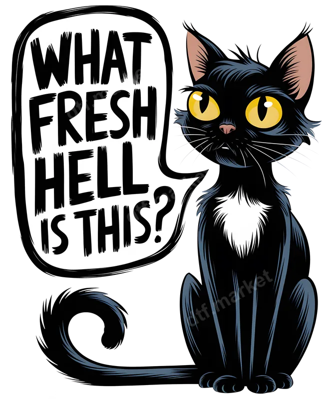 See allThis vibrant DTF transfer features an expressive black cat with wide, golden eyes, sitting poised and looking utterly dismayed. Above the feline, a speech bubble boldly declares, "WHAT FRESH HELL IS THIS?" in a distressed, hand-lettered style, perfectly capturing a mood of sarcastic exasperation. This high-quality, ready to press design brings a unique blend of pet charm and edgy humor to any garment, making it a standout piece for anyone who understands the daily grind. This funny iron on transfer is ideal for cat parents, sarcastic individuals, meme enthusiasts, or anyone with a dry sense of humor. It makes an excellent gift for birthdays, holidays, or just because, for friends, family, or even yourself. Perfect for adding a touch of personality to your everyday wardrobe, it’s suitable for casual wear, social gatherings, or simply expressing your mood without saying a word. Applying this apparel transfer is a breeze with either a professional heat press or a household iron. For best results with a heat press, apply at 300-325°F for 15 seconds with medium pressure. Simply peel the film warm or cool, depending on preference. This versatile heat press design works flawlessly on a wide range of fabrics, including cotton, polyester, and various blends, ensuring a strong, lasting bond without any tedious weeding required. Our direct to film transfers are crafted using premium materials to ensure exceptional durability and aesthetic appeal. You'll enjoy vivid colors, sharp details, and a remarkably soft hand feel that won’t crack or peel, even after numerous washes. Each shirt design is printed on professional-grade DTF film with a powerful adhesive, guaranteeing a long-lasting and professional finish that rivals screen printing.