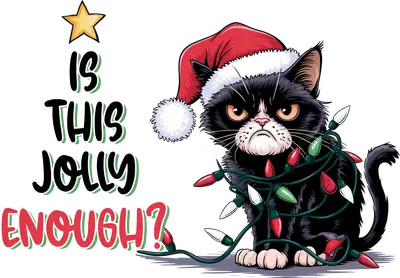 See allThis hilarious DTF transfer captures the spirit of Christmas... or lack thereof! Featuring a famously grumpy black cat, complete with a Santa hat and thoroughly tangled in a string of festive lights, this design perfectly conveys a sarcastic holiday mood. Above the cat, the playful text asks, "IS THIS JOLLY ENOUGH?" with a bright yellow star. This high-quality, ready to press transfer is ideal for anyone who finds the holiday cheer a little *too* much. This iron on transfer is perfect for cat lovers with a mischievous sense of humor, anti-Christmas enthusiasts, or anyone who just appreciates a good dose of sarcasm during the holidays. It makes an excellent gift for friends, family, or co-workers, and is fantastic for creating unique Christmas party shirts, casual holiday wear, or even funny pajama tops. Small t-shirt businesses and Etsy sellers looking for popular, humorous heat transfer designs for their holiday collections will find this design a fast-selling favorite. Applying this heat press transfer is a breeze, compatible with a wide range of fabrics including cotton, polyester, cotton-poly blends, and even nylon. Achieve professional results with a heat press at 300-325°F for 15 seconds with medium pressure, or apply easily with a household iron. Forget tedious weeding; just peel and press! It’s perfect for custom t-shirts, hoodies, sweatshirts, tote bags, pillow covers, and even aprons, transforming any item into a conversation starter. Every ready to press transfer boasts vibrant, full-color printing that captures every detail of the grumpy feline and twinkling lights. It offers a soft, crack-resistant finish without the heavy, stiff feel of traditional vinyl. Each direct to film transfer is produced on premium DTF film with a robust adhesive backing, ensuring professional, durable results that withstand countless washes and wear.