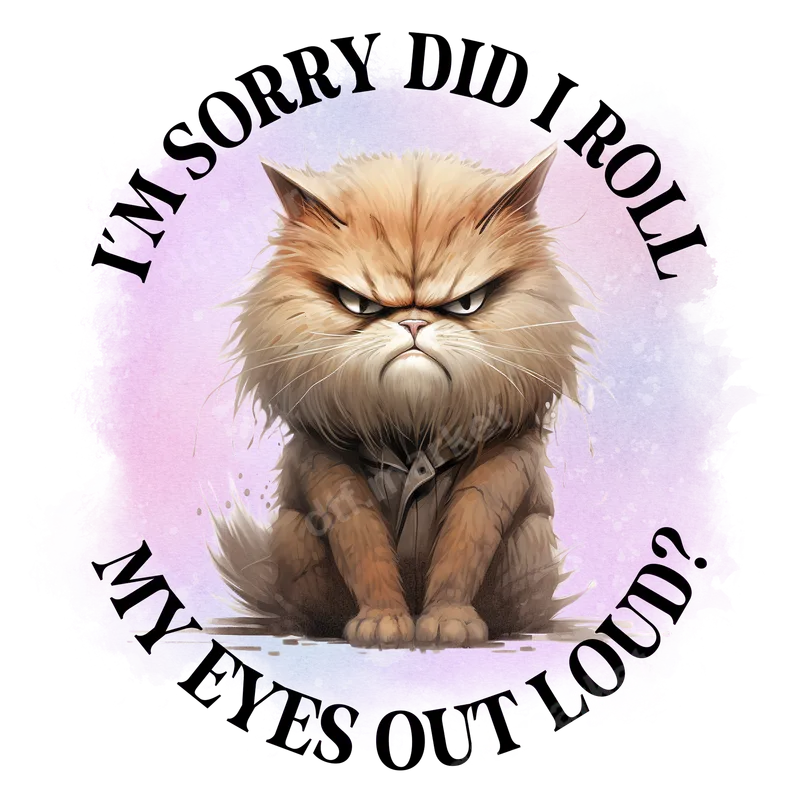 See allShow off your dry wit with this hilarious "I'M SORRY DID I ROLL MY EYES OUT LOUD?" DTF transfer featuring an intensely grumpy, fluffy orange Persian cat. This charmingly sassy design captures the universal feeling of exasperation with a cartoonish yet highly detailed illustration, set against a soft, subtly textured pink and purple watercolor background. This ready to press transfer is perfect for adding a touch of humor to any garment. This unique heat transfer design is ideal for cat owners, pet parents, and anyone who appreciates a good dose of sarcasm. It makes an excellent gift for birthdays, holidays, or just a fun surprise for friends and family with a shared love for grumpy felines and witty remarks. Transform everyday apparel into a statement piece that's sure to get a chuckle. Our premium DTF transfers are incredibly versatile and easy to apply using a heat press at 300-325°F for 15 seconds with medium pressure. For those without a professional press, a household iron on a firm surface can also achieve great results. Forget about tedious weeding; this iron on transfer is completely heat press ready for a smooth, hassle-free application on cotton, polyester, and various fabric blends. It's the perfect t-shirt transfer for DIY enthusiasts and small businesses alike. Expect nothing less than vibrant colors and crisp details with this apparel transfer. Each design is printed on high-quality DTF film with robust adhesive, ensuring a durable, crack-resistant finish that feels soft to the touch. This professional-grade heat press design maintains its integrity wash after wash, making your custom creations last.