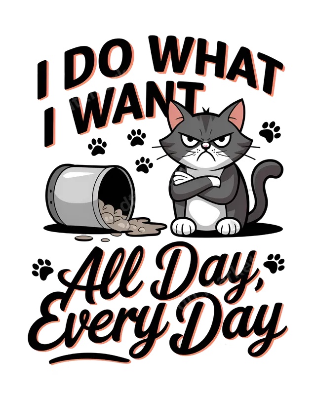 See allThis "I Do What I Want" DTF transfer features a hilariously grumpy cat with folded arms, casually ignoring spilled cat food, all surrounded by playful paw prints. Capturing the independent and sassy spirit of felines, this vibrant direct to film transfer is perfect for expressing a bit of rebellious "catitude." It arrives as a ready to press transfer, ensuring a quick and easy application to your favorite garments. Ideal for cat owners, animal lovers, and anyone who appreciates humorous, sarcastic designs, this heat press design makes a fantastic gift. Surprise a friend or family member for birthdays, Mother's Day, or just because with a custom t-shirt or hoodie that speaks to their inner feline. This unique shirt design is a perfect conversation starter at casual gatherings or for everyday wear. Applying this premium heat transfer is incredibly simple. Our DTF transfers work on various materials, including cotton, polyester, and blends. For professional results, use a heat press at 300-325°F for 15 seconds with medium pressure. A household iron can also be used with firm, even pressure and no steam. Best of all, this iron on decal requires no weeding, saving you time and effort on your apparel projects. Experience the exceptional quality of our professional heat press ready transfers. Crafted with high-grade DTF film and vibrant, durable inks, this design offers superior color fidelity and sharp detail. Enjoy a soft-to-the-touch finish that resists cracking, peeling, and fading, ensuring your custom transfer looks amazing and lasts wash after wash.