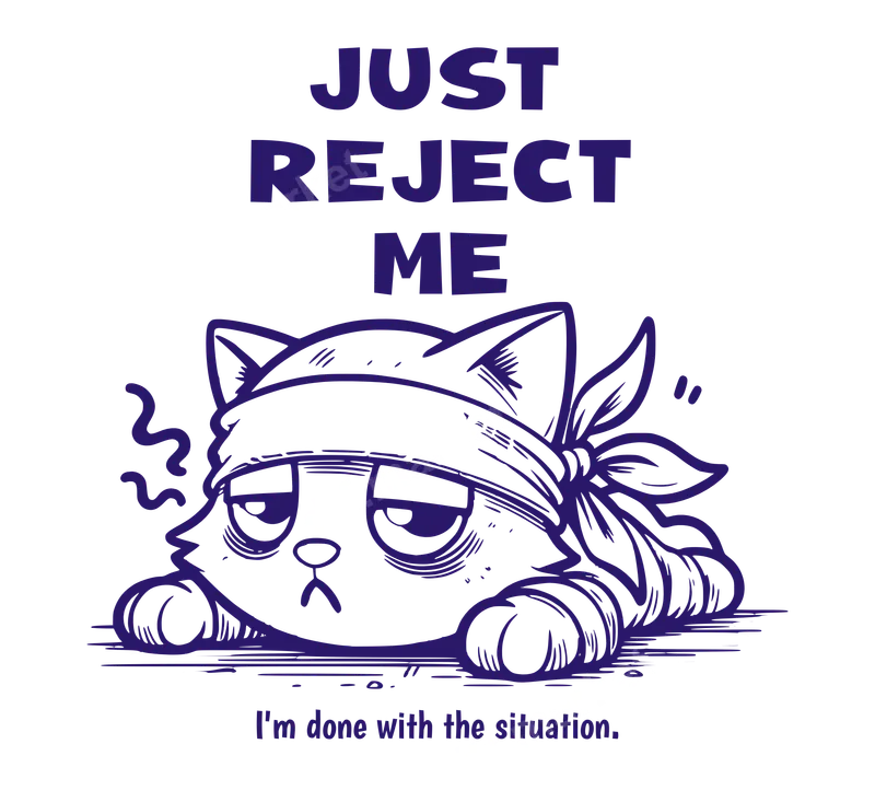 See allEmbrace your inner apathy with this hilariously relatable 'Just Reject Me' DTF transfer. Featuring a grumpy, tired-looking cat wearing a bandana with the text "JUST REJECT ME" prominently displayed, and a smaller, equally resigned "I'm done with the situation" below, this design perfectly captures that mood when you're just utterly exhausted. This ready to press design is a must-have for those days when you've reached your limit. This witty design is ideal for Gen Z humor enthusiasts, pet lovers with a sarcastic streak, students overwhelmed by assignments, or anyone in need of a good laugh on a stressful day. It makes a fantastic gag gift for friends, a relatable shirt for casual outings, or a personal statement piece for those who appreciate ironic and self-deprecating humor. Perfect for adding a touch of humor to your everyday wear. Applying this heat press transfer is straightforward for crafters and businesses alike. It works seamlessly on a wide range of fabric types, including cotton, polyester, and various blends. For optimal results, use a heat press at 300-325°F for 15 seconds with medium pressure, then cold peel. For home users, a household iron can also be used following similar temperature and pressure guidelines. No weeding or complicated setup required, making customization a breeze. Our DTF transfers are crafted using high-quality professional DTF film, ensuring vibrant colors that pop and excellent durability. The designs are crack-resistant, wash-fast, and remarkably soft to the touch, providing a comfortable feel on any garment. This premium iron on transfer with strong adhesive guarantees a long-lasting apparel transfer that maintains its look and integrity through countless washes, letting your sarcastic statement shine.