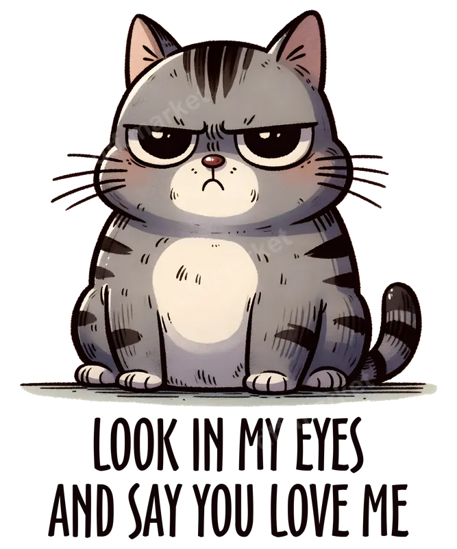 See allThis adorable yet hilariously grumpy cat DTF transfer features a gray tabby staring intently with furrowed brows, demanding love. Below the illustration, the bold text reads, "LOOK IN MY EYES AND SAY YOU LOVE ME." This design perfectly captures the sassy attitude of a pet who knows what they want, making it a fantastic ready to press transfer for anyone with a strong-willed feline companion or a playful sense of humor. The vibrant colors and clear lines ensure a professional finish on any garment. This humorous heat transfer is ideal for devoted cat parents, sassy pet owners, or anyone who appreciates a good dose of animal-themed wit. It makes an excellent gift for birthdays, Mother's Day, Christmas, or just a fun surprise for a friend who loves their cats perhaps a bit too much. Customize t-shirts, sweatshirts, hoodies, or even pet beds to show off your feline affection and attitude. Applying this heat press design is incredibly simple. It works flawlessly on a wide range of materials, including cotton, polyester, and various fabric blends. For best results, use a heat press at 300-325°F for 15 seconds with medium pressure. Unlike traditional vinyl transfer methods, there’s absolutely no weeding required, saving you time and effort. Just press, peel (cold peel), and enjoy your perfectly customized item. Our premium DTF transfers boast incredibly vibrant colors and exceptional durability. Each iron on transfer is printed using professional-grade DTF film and high-quality inks, ensuring your design resists cracking, peeling, and fading wash after wash. The finished apparel transfer feels soft to the touch, seamlessly integrating with the fabric for a high-end, comfortable feel that will last.