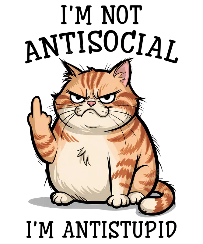 See allUnleash your inner curmudgeon with our 'I'm Not Antisocial, I'm Antistupid' DTF transfer. This bold and humorous design features an adorably grumpy orange tabby cat making a clear, sassy statement with a raised middle finger. It's the perfect ready to press DTF transfer for those who appreciate sharp wit and a touch of irreverence. This unique direct to film transfer easily transforms any garment into a statement piece. This sarcastic heat press design is ideal for cat enthusiasts, introverts with a sense of humor, or anyone tired of dealing with foolishness. It makes a fantastic gift for friends, family, or even yourself, for birthdays or holidays. Perfect for casual wear or social gatherings where you want to make a point, this design will spark conversations and knowing smiles. Our premium DTF transfers apply to cotton, polyester, and blends. For best results, use a heat press at 300-325°F for 15 seconds with medium pressure, then cool peel. A household iron can also be used (follow included instructions). Forget tedious weeding; this iron on transfer is ready to apply straight out of the package, making custom apparel simple. Experience superior quality with vibrant colors that pop and a soft-to-the-touch finish that won't crack or peel. Each direct to film transfer is printed using professional-grade DTF film and inks, ensuring durability and a long-lasting design wash after wash. The strong adhesive guarantees your design stays put, making your custom apparel truly stand out. Enjoy a professional-grade shirt design with every application.