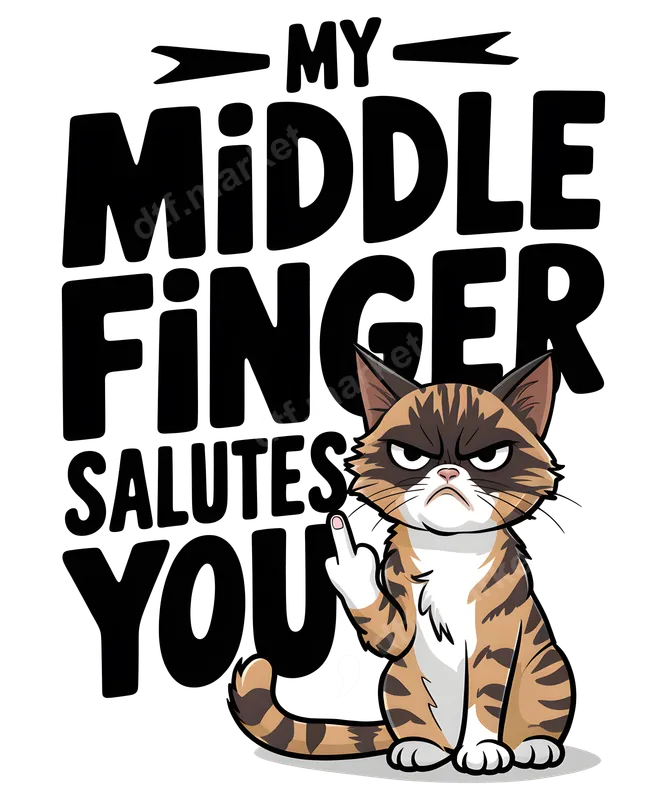 See allThis hilarious DTF transfer features a notoriously grumpy cat defiantly raising its middle finger, accompanied by the bold, block letter text, "MY MIDDLE FINGER SALUTES YOU." The design captures a perfect blend of sarcastic humor and feline attitude, making it an instant conversation starter. This ready to press transfer is ideal for anyone looking to add a touch of edgy, playful rebellion to their wardrobe or accessories. Perfect for cat enthusiasts with a sassy sense of humor, this design makes an excellent gift for friends who love funny animal memes or have a dry wit. It's suitable for casual wear, social gatherings, or simply expressing a fun, no-nonsense attitude. Ideal for birthdays, white elephant gifts, or just treating yourself to a unique, attention-grabbing apparel transfer. Our high-quality heat press transfer is incredibly versatile, adhering beautifully to a wide range of fabrics including cotton, polyester, and various blends. Application is a breeze: simply use a professional heat press at 300-325°F for 15 seconds with medium pressure. While a heat press is recommended for best results, you can also apply this iron on transfer using a household iron. Best of all, there's absolutely no weeding required, saving you time and effort. Experience superior quality with this direct to film transfer. Our DTF prints boast vibrant colors, exceptional durability, and a soft-to-touch finish that feels great on any garment. Crafted from professional-grade DTF film with a strong adhesive, these designs are crack-resistant and built to last through countless washes, ensuring your witty statement stays sharp and clear.