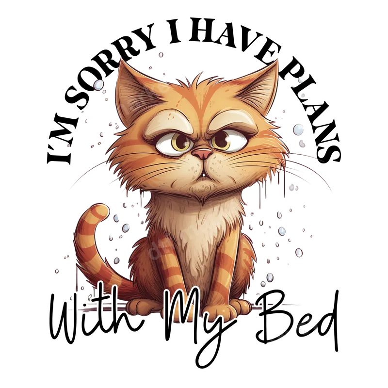 See allShow off your love for lounging with this adorable yet hilariously grumpy orange tabby cat DTF transfer. Featuring the relatable phrase, "I'm Sorry I Have Plans With My Bed," this design captures the essence of a cozy night in. This high-quality direct to film transfer is perfect for adding a touch of humor and personality to your wardrobe. It arrives as a ready to press design, making custom apparel creation simple and fun for everyone. This unique design is ideal for cat moms, introverts, homebodies, or anyone who appreciates a good laugh and the comfort of their bed. It makes a fantastic gift for birthdays, holidays, or just because, for friends, family, or even yourself! Perfect for casual wear, weekend relaxation, or as a conversation starter, this iron on transfer celebrates the joy of taking it easy. Applying your new heat press transfer is incredibly easy, whether you're using a professional heat press or a household iron. For best results with a heat press, apply at 300-325°F for 15 seconds with medium, even pressure. This durable t-shirt transfer works flawlessly on a wide variety of fabrics, including cotton, polyester, and their blends. The best part? There's absolutely no weeding required, saving you time and effort. Experience professional-grade quality with every dtf.market design. Our heat press designs boast vibrant colors, exceptional detail, and a soft-to-the-touch finish that feels comfortable on any garment. Printed on premium DTF film with a strong, flexible adhesive, these ready to press transfers are designed to be crack-resistant and withstand countless washes, ensuring your personalized apparel looks fantastic for a long time.