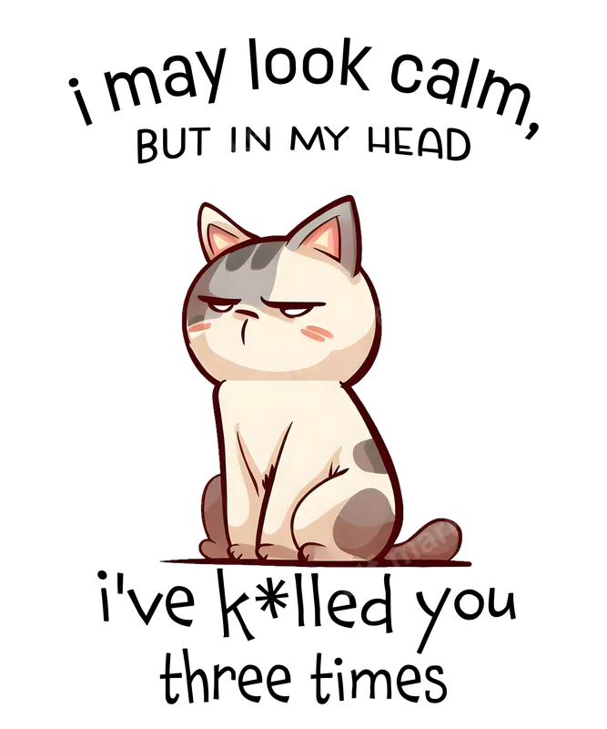 See allThis hilarious DTF transfer features an adorable yet undeniably grumpy cat, perfectly encapsulating that inner monologue we all have. Below the stern-faced feline, the witty phrase reads, 'I may look calm, BUT IN MY HEAD I've k*lled you three times.' This ready to press design is a must-have for anyone with a sarcastic sense of humor and a love for our feline friends. Ideal for introverts, cat parents, or anyone who appreciates a bit of dark humor, this heat press transfer makes a fantastic gift for birthdays, holidays, or just because. Perfect for expressing your true feelings without saying a word, it’s great for everyday wear, casual outings, or even as a conversation starter at pet-themed events. Give the gift of a good laugh with this unique iron on decal. Applying this direct to film transfer is incredibly easy! It works beautifully on a wide variety of fabrics, including cotton, polyester, and their blends. For best results, use a heat press at 300-325°F for 15 seconds with medium pressure. You can also achieve great results with a household iron, following similar temperature and pressure guidelines. Best of all, there's no weeding required, making your customization project a breeze. Experience professional quality with every application. Our DTF transfers boast vibrant colors that truly pop, exceptional crack-resistant durability, and a remarkably soft-to-touch finish that integrates seamlessly with your garment. Each apparel transfer is crafted using premium DTF film and strong adhesive, ensuring your design lasts wash after wash without fading or peeling. Create high-quality custom t-shirts effortlessly.