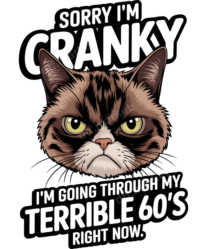 See allThis hilarious DTF transfer features a classic grumpy cat expression, perfectly embodying the sentiment "SORRY I'M CRANKY I'M GOING THROUGH MY TERRIBLE 60'S RIGHT NOW." The bold, easy-to-read typography complements the iconic frowny feline, making for an instantly recognizable and laugh-out-loud design. This ready to press transfer is designed for maximum visual impact and durability, ready to transform any garment into a conversation starter. This funny iron on decal is perfect for anyone celebrating or commiserating their 60th birthday, or simply embracing the wisdom (and occasional grumpiness) that comes with age. It makes an excellent gift for parents, grandparents, friends, or even yourself. Ideal for birthday parties, retirement celebrations, or just everyday wear for the cat lover with a great sense of humor. It's a fantastic way to add a unique touch to your apparel. Applying this heat press transfer is incredibly easy, suitable for a wide variety of fabric types including cotton, polyester, and blends. For best results, use a heat press at 300-325°F for 15 seconds with medium pressure. It can also be applied with a household iron, although a heat press is recommended for professional results. Unlike traditional vinyl transfers, there's no weeding required; simply press and peel! Our direct to film transfers boast vibrant, true-to-color prints that resist cracking and peeling, ensuring your design looks fantastic for years to come. The soft-touch finish means the design feels integrated with the fabric, not stiff or bulky. Crafted using professional-grade DTF film and strong adhesive, these apparel transfers offer superior washability and longevity, making them a premium choice for custom t-shirts and other garments.