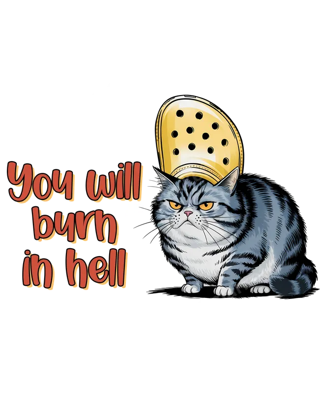 See allUnleash your inner sarcasm with this unique DTF transfer featuring a highly expressive, grumpy gray tabby cat wearing a bright yellow Croc shoe on its head like a crown. Beside this comically disgruntled feline, the bold red-orange text declares, "You will burn in hell," presented in a playful, almost retro bubble font. This eye-catching design merges internet meme culture with dark humor, making it a perfect ready to press statement piece for those who appreciate the absurd and edgy. This amusing apparel transfer is ideal for Gen Z humor enthusiasts, meme connoisseurs, sarcastic cat owners, and anyone looking to add a touch of ironic fashion to their wardrobe. It makes a fantastic gag gift for friends with a dark sense of humor, or a standout design for casual wear, social gatherings, or simply making a bold, funny statement wherever you go. This design is certainly not for the faint of heart or sensitive audiences, but perfect for a laugh among the right crowd. Our DTF transfers are incredibly versatile and can be applied to a wide range of fabrics, including cotton, polyester, and various blends, making them a superior choice compared to traditional vinyl transfers. Applying your iron on transfer is simple with a heat press (300-325°F for 15 seconds with medium pressure) or even a standard household iron. Say goodbye to tedious weeding; these designs arrive ready to press, ensuring a quick and easy application process. Experience professional-grade quality with vibrant colors and a soft, flexible finish that integrates seamlessly with your garment. Our direct to film transfer technology ensures excellent durability, crack resistance, and a long-lasting print that will withstand countless washes without fading. Elevate your custom apparel game with this high-quality, heat press ready design from dtf.market.