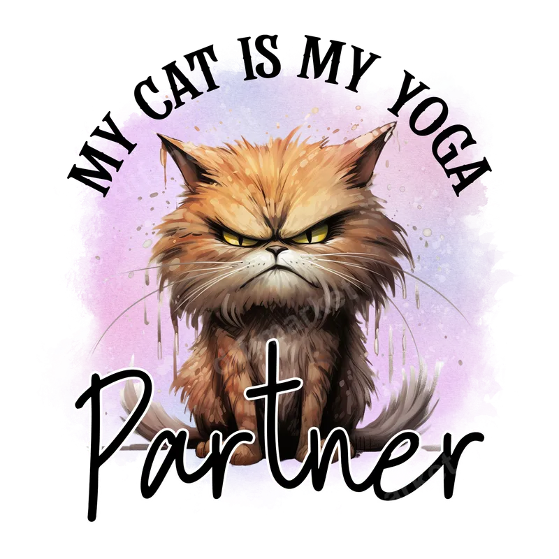 See allThis humorous DTF transfer features a grumpy orange cat with the text "MY CAT IS MY YOGA Partner." The cat's scrunched face and intense yellow eyes, set against a watercolor splash, capture feline exasperation. This ready to press design highlights the unique, funny bond pet owners share with their companions. It's a playful nod to the 'purr-fectly' imperfect moments of cat ownership. This funny heat transfer is perfect for cat moms, dads, and yoga enthusiasts with a sense of humor. It's an ideal gift for birthdays, Mother's Day, or Christmas. Wear it for casual outings or while lounging with your cat. This apparel transfer is sure to bring smiles and spark conversations. Applying this heat press ready design is simple. Our high-quality iron on transfer works beautifully on cotton, polyester, and blends. For optimal results, use a heat press at 300-325°F for 15 seconds with medium pressure, then cold peel. A household iron can also be used carefully. These ready to press transfers allow for quick, easy customization without weeding. Our DTF transfers offer exceptional quality. Expect vibrant colors, superior durability resisting cracking and fading, and a soft-to-the-touch finish. Each direct to film transfer is printed on professional-grade DTF film with strong adhesive, ensuring your custom shirt design lasts. Elevate your wardrobe with a durable, eye-catching graphic.