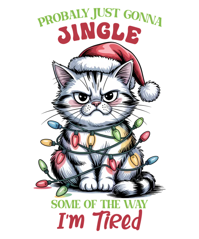 See allDive into the holiday spirit with a touch of relatable humor using this grumpy cat DTF transfer. This unique design features a stern-faced, fluffy white cat in a Santa hat, hilariously tangled in colorful Christmas lights. The text, "PROBALY JUST GONNA JINGLE SOME OF THE WAY I'M TIRED," perfectly captures holiday fatigue with playful sarcasm. This ready to press design is ideal for adding personality to your festive wardrobe or creating memorable gifts. Perfect for cat lovers, those with a dry sense of humor, or anyone embracing holiday exhaustion, this direct to film transfer enhances your Christmas celebrations. Whether for a holiday party, family gathering, or a witty conversation starter, this design fits perfectly. It's a fantastic gift idea for Secret Santa, feline-adoring friends, or family who appreciate a good laugh during the most wonderful time of the year. Applying this heat press design is simple and compatible with cotton, polyester, and blends. For best results, use a heat press at 300-325°F for 15 seconds with medium pressure (warm or cool peel). If using a household iron, ensure firm, even pressure and no steam. Our high-quality iron on transfer requires no weeding, making your customization quick and effortless, so you can enjoy your new apparel transfer in minutes. Experience professional-grade quality with this vibrant and durable shirt design. Crafted on premium DTF film, our transfers boast exceptional color vibrancy, crack resistance, and a remarkably soft feel once applied. The strong adhesive ensures your design stays put, offering long-lasting wear and countless washes without fading or peeling. Create custom t-shirts, hoodies, tote bags, and more with a finish that looks professionally printed and feels great.