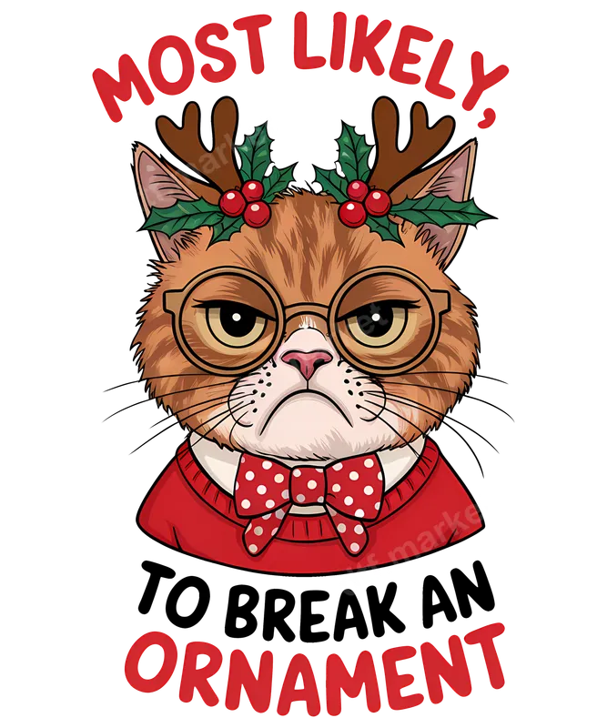 See allThis hilarious DTF transfer features a perfectly grumpy ginger cat, sporting stylish round glasses, festive reindeer antlers adorned with holly and berries, and a dapper red sweater with a polka-dot bow tie. The bold text "MOST LIKELY, TO BREAK AN ORNAMENT" captures the mischievous spirit of cats during the holiday season. This ready to press design is perfect for adding a touch of humor and personality to any garment, making it a standout piece for Christmas. Ideal for cat lovers, meme enthusiasts, or anyone with a sarcastic sense of humor during the holidays, this heat transfer is a fantastic choice for festive gatherings, ugly Christmas sweater parties, or simply expressing your pet's true nature. It makes a unique gift for friends, family, or even yourself, adding a touch of playful chaos to your Christmas celebrations. Applying this vibrant apparel transfer is simple and efficient. It works beautifully on a wide range of materials, including cotton, polyester, and various fabric blends. For best results, use a heat press at 300-325°F for 15 seconds with medium pressure. It can also be applied with a household iron with careful technique, making it a versatile iron on transfer solution. Enjoy the convenience of a "no weeding" design, getting you from transfer to finished garment in minutes. Crafted with professional-grade DTF film, this direct to film transfer boasts exceptional durability and vivid color reproduction. The print is crack-resistant, incredibly soft to the touch, and designed to withstand numerous washes, ensuring your festive feline stays grumpy and bright for seasons to come.