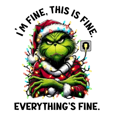See allCapture the chaotic, yet relatable, spirit of the holidays with this hilarious grumpy character DTF transfer. Featuring a familiar green, scowling face tangled in colorful Christmas lights, wearing a Santa hat and jacket, this design perfectly embodies the popular meme: "I'M FINE, THIS IS FINE. EVERYTHING'S FINE." This vibrant, ready to press design is a must-have for anyone who embraces the humorous side of holiday stress.