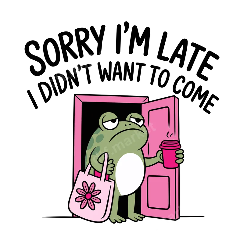 See allThis vibrant DTF transfer features a hilariously grumpy frog holding a coffee cup and tote bag, with the relatable phrase "SORRY I'M LATE I DIDN'T WANT TO COME." It perfectly captures that anti-social, coffee-fueled morning mood. This ready to press transfer is designed for instant application, bringing a dose of sarcastic charm to any garment. This funny heat transfer is ideal for introverts, coffee lovers, or anyone with a dry sense of humor. Perfect for casual wear, office parties (where you'd rather not be), or as a unique gift for friends who share your reluctance to socialize. It’s also a great conversation starter for those who appreciate a good sarcastic statement. Our high-quality direct to film transfers are incredibly versatile, adhering beautifully to cotton, polyester, and most fabric blends. Applying this iron on transfer is a breeze with a heat press (300-325°F for 15 seconds, medium pressure) or a household iron. Forget the hassle of weeding vinyl transfers; these designs are heat press ready to go straight onto your shirt. Experience professional-grade results with our durable heat press designs. Each apparel transfer boasts vibrant colors, excellent wash durability, and a soft-to-touch finish that resists cracking and peeling. We use premium DTF film and strong adhesive to ensure your design looks fantastic and lasts for many wears to come.