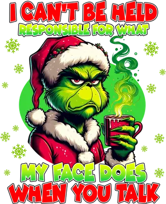 See allUnleash your inner holiday grump with this hilariously expressive DTF transfer featuring a familiar green, furry character in a festive Santa hat and suit, sipping from a mug. The vibrant design is adorned with green snowflakes and a relatable quote: "I CAN'T BE HELD RESPONSIBLE FOR WHAT MY FACE DOES WHEN YOU TALK." This ready to press design perfectly captures the spirit of sarcastic humor during the most wonderful time of the year. This funny Christmas iron on transfer is perfect for anyone who appreciates a good dose of sarcasm during the holidays, Grinch fans, introverts, or those who simply aren't morning people. It makes an excellent gag gift for office parties, white elephant exchanges, or Secret Santa. Small t-shirt businesses and crafters looking for unique, humorous holiday apparel will find this heat transfer design a popular seller, ideal for creating custom gifts or festive outfits for family and friends. Applying this heat press transfer is incredibly easy, making it ideal for both beginners and experienced crafters. It works wonderfully on cotton, polyester, cotton-poly blends, and even nylon fabrics. Simply use a heat press at 300-325°F for 15 seconds with medium pressure, or apply with a household iron. There's no tedious weeding required—just peel and press! Create custom t-shirts, cozy hoodies, sweatshirts, tote bags, pajamas, or unique aprons with professional, long-lasting results. For best care, wash garments inside out and tumble dry on low heat. Each ready to press transfer boasts vibrant, full-color printing with exceptional fine detail, ensuring your finished product looks spectacular. The design is crack-resistant and soft to the touch, avoiding that heavy, plasticky vinyl feel. Our direct to film transfer is printed on premium DTF film with a strong adhesive backing, guaranteeing a flawless application and durable finish every time. Elevate your holiday creations with this high-quality, professional-grade transfer.