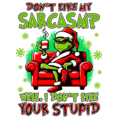 See allGet into the anti-holiday spirit with this hilarious Grumpy Grinch Sarcasm DTF transfer! Featuring a disgruntled green character, much like the Grinch, donned in a Santa suit and lounging on a red sofa with a steaming mug, this design perfectly captures cynical holiday cheer. The bold text declares, "DON'T LIKE MY SARCASM? WELL, I DON'T LIKE YOUR STUPID," surrounded by festive snowflakes. This vibrant, full-color DTF transfer is ready to press, bringing an instant laugh to any garment. This sarcastic Grinch heat transfer design is perfect for anyone with a witty sense of humor, Grinch fans, or those who prefer to add a little edge to their holiday outfits. It makes an excellent conversation starter at Christmas parties, a memorable white elephant gift, or unique apparel for small t-shirt businesses looking to offer something distinct. Crafters and Etsy shop owners will find this iron on transfer a quick and easy way to create popular, funny holiday merchandise. Applying this heat press transfer is incredibly simple. It adheres beautifully to a wide range of materials including cotton, polyester, cotton-poly blends, and even nylon. For best results, use a heat press at 300-325°F for 15 seconds with medium pressure, or apply with a household iron. There's no tedious weeding required—just peel and press! Create custom t-shirts, cozy hoodies, festive sweatshirts, unique tote bags, or fun aprons and pillow covers with ease. For lasting durability, wash garments inside out and tumble dry low. Experience professional quality with this ready to press transfer, showcasing vibrant, full-color printing and exceptional fine detail. The design is crack-resistant and soft to the touch, avoiding the heavy, stiff feel often associated with vinyl transfers. Each direct to film transfer is printed on premium DTF film with a strong, reliable adhesive backing, ensuring outstanding results for all your apparel and accessory customization projects.