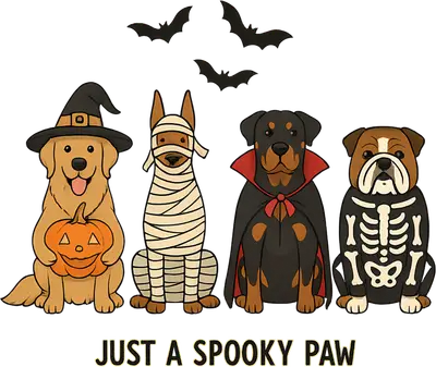 See allThis charming DTF transfer features four adorable dogs dressed in their Halloween best, accompanied by flying bats and the playful phrase "Just A Spooky Paw." A Golden Retriever wears a witch hat with a jack-o'-lantern, a Doberman is wrapped like a mummy, a Rottweiler transforms into a vampire, and an English Bulldog sports a skeleton suit. This vibrant design captures the fun and spirit of the spooky season, making it a perfect ready to press graphic for festive apparel. This design is perfect for dog lovers, Halloween enthusiasts, crafters, and small business owners creating holiday apparel. It's an ideal iron on transfer for individuals looking to create unique shirts for trick-or-treating or Halloween parties. Small Etsy shops and boutique owners can easily incorporate this popular heat transfer design into their fall and holiday collections, appealing to families and pet owners. Makes a great gift for pet parents too! Applying this heat press transfer is simple, adhering beautifully to cotton, polyester, blends, and even nylon. Achieve professional results with a heat press (300-325°F for 15 seconds, medium pressure) or household iron. No weeding; just peel and press! This design is fantastic for custom t-shirts, hoodies, sweatshirts, tote bags, and denim jackets. Wash inside out, tumble dry low for durability. Our ready to press transfer delivers exceptional quality with vivid, full-color printing and crisp details. Enjoy a soft, flexible feel that won't crack or peel like vinyl. Each direct to film transfer uses premium DTF film and top-grade inks, ensuring strong, lasting adhesion and a professional finish on all apparel projects. You'll love the vibrant results and ease of creating high-quality garments.