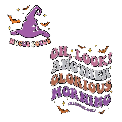See allConjure up some Halloween magic with this fun two-piece DTF transfer set, perfect for fans of classic spooky season vibes and sarcastic humor. The first design features a whimsical purple witch hat, adorned with sparkling stars and flying bats, accompanied by the iconic 'Hocus Pocus' text in a groovy retro font. The second, equally charming design, reads 'OH, LOOK! ANOTHER GLORIOUS MORNING (MAKES ME SICK.)' – a beloved movie quote – styled in matching pastel retro lettering, also surrounded by stars and bats. Both designs capture a playful yet spooky aesthetic, making them a fantastic ready to press addition to your fall apparel collection.