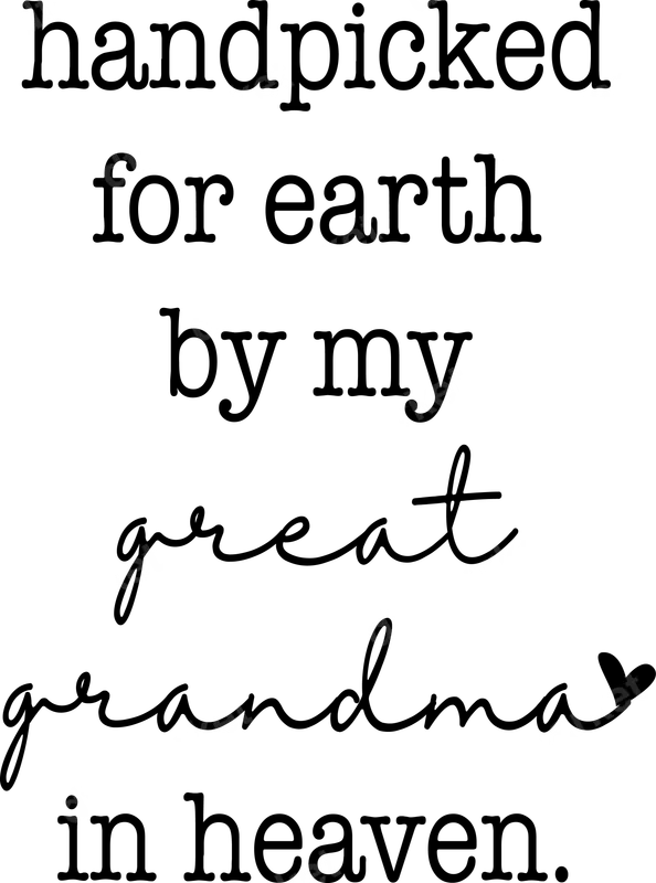 See allCelebrate the cherished memory of a beloved great-grandma with this beautiful 'Handpicked for Earth by My Great Grandma in Heaven' DTF transfer. This touching design features a mix of elegant script and bold block fonts, creating a heartfelt tribute. It’s a perfect ready to press transfer for anyone wanting to keep their loved one’s spirit close, making it an ideal choice for custom apparel projects. This deeply sentimental design is ideal for grandchildren, family members, or anyone who wishes to honor a great-grandmother's enduring love and presence. It makes a thoughtful gift for Mother's Day, Grandparents Day, birthdays, anniversaries, or as a loving memorial. Easily create personalized t-shirts, hoodies, or tote bags that carry a powerful message. This versatile iron on transfer is perfect for expressing your love and remembrance. Applying this heat press transfer is incredibly simple. Designed for a professional finish, our ready to press designs require no weeding and work seamlessly with a heat press at 300-325°F for just 15 seconds. It’s suitable for a wide range of fabrics, including cotton, polyester, and blends. Transform t-shirts, sweatshirts, hoodies, onesies, tote bags, or even memorial blankets into cherished keepsakes with this easy-to-use heat press design. Experience superior quality with our premium DTF transfers. This apparel transfer boasts vibrant, crack-resistant colors and a soft-touch feel that integrates smoothly with your fabric, ensuring lasting durability. Each direct to film transfer is produced using top-grade film and adhesive, guaranteeing a strong bond and professional results wash after wash. Create stunning, long-lasting custom garments that honor your loved one beautifully.