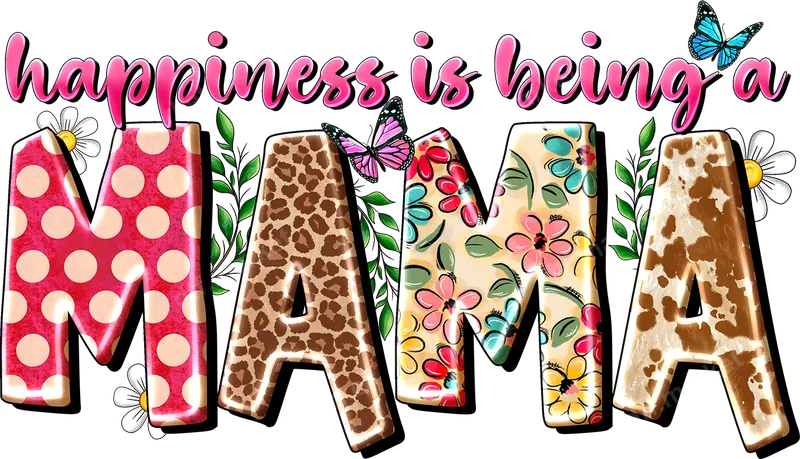 See allThis vibrant DTF transfer proudly proclaims "happiness is being a MAMA" in a charming script above bold, patterned letters. Each letter of "MAMA" features a unique, eye-catching design: the first M sports playful red polka dots, the first A trendy leopard print, the second M blossoms with colorful watercolor florals, and the final A showcases a rustic cowhide pattern. Lush green foliage, delicate daisies, and whimsical butterflies add a touch of natural beauty, making this a truly unique ready to press design for celebrating mothers. This cheerful heat transfer is designed for proud mothers, new moms, grandmas, and anyone who cherishes the joy of motherhood. It’s an ideal iron on transfer for crafting personalized gifts for Mother's Day, birthdays, baby showers, or just because. Create custom t-shirts, unique sweatshirts, or special tote bags for mom friends. This versatile design makes a thoughtful present that celebrates the heart of every family. Applying this ready to press transfer is simple and hassle-free, suitable for cotton, polyester, and various blends. For professional results, use a heat press at 300-325°F for 15 seconds with medium pressure, then peel cold. A household iron can also be used for smaller projects. This apparel transfer requires no weeding, trimming, or layering – just press and go! Our direct to film transfers are crafted using premium DTF film and inks, ensuring vibrant colors and exceptional durability. The result is a soft, flexible finish that resists cracking and fading, maintaining its fresh look wash after wash. This professional heat press design adheres securely to your chosen garment, providing a long-lasting design that you and your loved ones will adore.