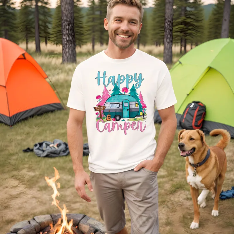 See allEmbrace the spirit of adventure with our 'Happy Camper' DTF transfer. This cheerful and colorful direct to film transfer features a whimsical retro-style teal camper trailer nestled between vibrant pink and teal trees and blooming flowers. A charming "Camp Lake Here" sign and a small ukulele add to the rustic, joyful ambiance. This ready to press design brings a nostalgic, outdoorsy vibe to any garment or accessory, making it perfect for those who love to explore and enjoy nature. This unique heat transfer is ideal for camping enthusiasts, RV owners, glampers, and anyone who cherishes the great outdoors. It's a fantastic choice for family camping trips, summer vacations, road trips, or as a thoughtful gift for birthdays, Father's Day, or Mother's Day for the adventurer in your life. Create custom apparel for your next lakeside retreat, forest getaway, or simply to show off your love for the camper lifestyle. It's also perfect for small businesses looking to add popular outdoor-themed apparel to their collections. Applying your new Happy Camper iron on transfer is incredibly simple. Our premium DTF transfers work seamlessly on a wide range of materials, including cotton, polyester, and various blends. For best results, apply with a heat press at 300-325°F for 15 seconds with medium pressure, then peel cold. You can even use a high-quality household iron with careful, even pressure. Unlike traditional vinyl transfer, there's absolutely no weeding required, saving you time and effort. Experience professional-grade quality with every application. Our DTF transfers boast incredibly vibrant colors that pop, ensuring your custom shirt design stands out. They are engineered to be crack-resistant, peel-resistant, and incredibly soft to the touch, providing a comfortable, long-lasting finish that feels like part of the fabric. Each heat press design is printed on durable, high-quality DTF film with strong adhesive, guaranteeing a flawless application and exceptional durability wash after wash.