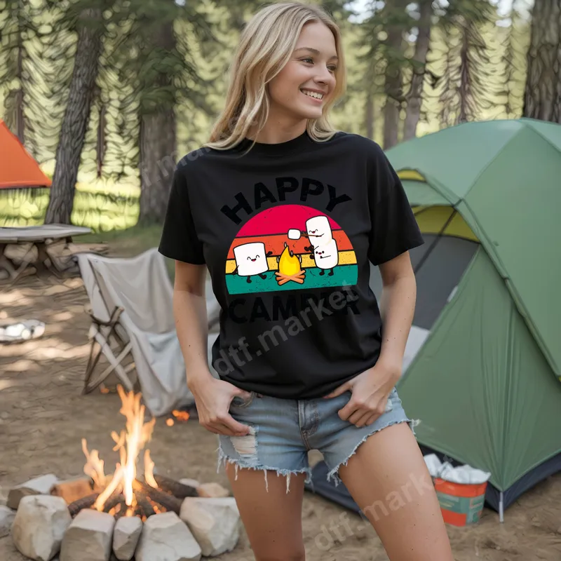 See allThis adorable 'Happy Camper' DTF transfer brings a touch of retro charm to your outdoor apparel. Featuring two happy cartoon marshmallows roasting a third over a flickering campfire, all set against a vibrant striped sunset or sunrise, this design perfectly captures the joy of camping. The bold 'HAPPY CAMPER' text completes the scene, making it a cheerful and inviting ready to press transfer for all your adventurous gear. This delightful DTF transfer is ideal for anyone who loves the great outdoors, camping trips, glamping, or simply enjoys a cozy campfire. It's a fantastic choice for families planning summer vacations, friends heading to outdoor festivals, or as a thoughtful gift for the nature enthusiast in your life. Add some fun to your next camping adventure or outdoor gathering with this unique design. Applying this heat press transfer is incredibly easy. It works seamlessly on a wide variety of materials, including cotton, polyester, and most fabric blends. For best results, use a heat press at 300-325°F for 15 seconds with medium pressure. It can also be applied with a household iron, making it an accessible iron on transfer for everyone. Best of all, there's no weeding required – simply press and peel! Our premium DTF transfers are known for their exceptional quality. This t-shirt transfer boasts vibrant colors that pop, superior crack resistance for long-lasting wear, and a soft-to-touch finish that feels great on any garment. Crafted with professional DTF film and strong adhesive, this apparel transfer ensures a durable and high-quality result that will stand up to countless washes and adventures.