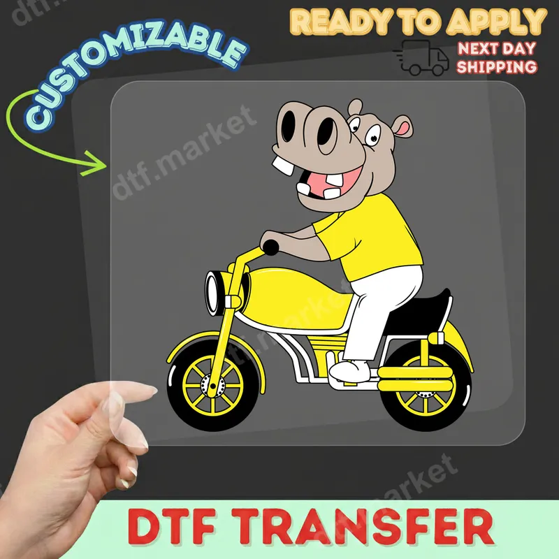 See allThis cheerful DTF transfer features an adorable cartoon hippo joyfully cruising on a bright yellow motorcycle, flashing a big, happy grin. With its vibrant colors and playful style, this ready to press design brings a whimsical touch to any garment or accessory. It's an instant mood-lifter, perfect for adding a burst of fun and character to your apparel. Ideal for kids and the young at heart, this fun hippo heat transfer makes a fantastic personalized gift for birthdays, school events, or just because. Parents and crafters looking for unique, easy-to-apply designs will love this charming motif. It's also perfect for creating matching shirts for family outings or as a delightful iron on transfer for a child's favorite backpack. Applying this high-quality t-shirt transfer is simple and efficient. It works beautifully on a wide range of fabrics, including cotton, polyester, and their blends, making it incredibly versatile. For best results, use a heat press at 300-325°F for 15 seconds with medium pressure, then perform a warm peel. A household iron can also be used with care. There's no tedious weeding required, so you can achieve professional results effortlessly. Crafted using premium DTF film and strong adhesive, this direct to film transfer ensures a durable, vibrant finish that stands the test of time. The colors remain brilliant wash after wash, and the design is crack-resistant, maintaining a soft, flexible feel on the fabric. You'll get a professional-grade heat press design that looks and feels great, ready to be showcased on your favorite items.