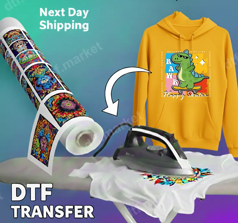 See allRoll into fun with our adorable Happy Skater Dinosaur DTF transfer! This vibrant design features a cool green dinosaur confidently riding a yellow skateboard, surrounded by bold "RAW" lettering and playful "Happy Skater" text. It's an instant dose of energy, perfect for anyone who loves dinosaurs, skateboarding, or quirky charm. This high-quality direct to film transfer is completely ready to press onto your favorite apparel. This unique heat press design is perfect for gifting or personalizing items for a wide range of audiences. Ideal for kids, teens, and young adults who are fans of dinosaurs or the skate culture aesthetic. It makes an excellent birthday gift, a fun addition to school wear, or a cool statement for casual outings and summer adventures. Surprise a future paleontologist, a budding skateboarder, or simply someone who appreciates a cute and edgy graphic. Applying this iron on transfer is a breeze, whether you're a seasoned crafter or a beginner. Our DTF transfers work seamlessly on a variety of materials including cotton, polyester, and most fabric blends. For best results, use a heat press at 300-325°F for 15 seconds with medium pressure, then cold peel the film. A household iron can also be used with firm, even pressure. Enjoy professional-looking results without the hassle of weeding or layering vinyl! Experience superior quality with every t-shirt transfer. Our professional-grade DTF film ensures exceptionally vibrant, crack-resistant, and fade-resistant colors that remain soft to the touch. These apparel transfers guarantee your custom garments look fantastic and feel comfortable for a long time. Add this long-lasting, eye-catching design to your collection and stand out.