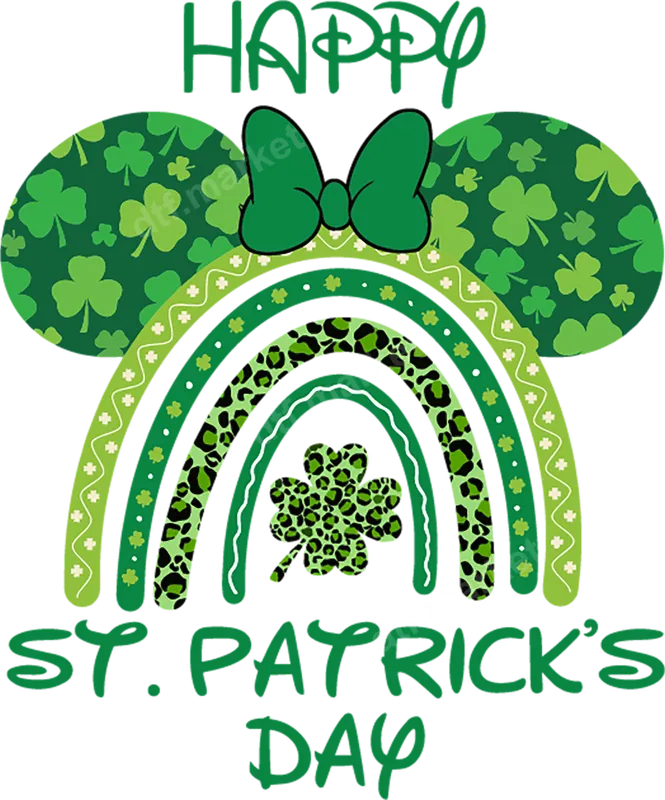 See allThis vibrant DTF transfer features a playful "HAPPY ST. PATRICK'S DAY" message, beautifully complemented by Mickey Mouse-inspired ears adorned with lucky shamrocks. A festive green bow sits between the ears, above a charming rainbow design. The rainbow itself showcases a delightful mix of green patterns, including trendy leopard print and classic shamrock motifs, with a matching leopard print shamrock at its heart. This ready to press design brings a touch of Irish cheer with a magical twist to any garment. This festive heat transfer is perfect for anyone looking to celebrate St. Patrick's Day with a unique and cheerful design. It's ideal for Disney fans, families, teachers, or friends attending parades, parties, or simply wanting to show their Irish spirit. Create custom gifts for loved ones, or design matching shirts for a group outing. It's also a fantastic way to add a bit of lucky charm to your own wardrobe for the holiday. Our direct to film transfer is incredibly versatile, adhering beautifully to a wide range of materials including cotton, polyester, and various fabric blends. Application is a breeze; simply use a heat press at 300-325°F for 15 seconds with medium pressure, or apply with a household iron for smaller projects. The best part? There's absolutely no weeding required, saving you time and effort so you can enjoy your custom creation faster. Experience professional quality with every iron on transfer from dtf.market. Our DTF transfers are known for their vibrant colors that pop, superior crack resistance, and a soft, smooth feel that integrates seamlessly with your fabric. Crafted using high-quality DTF film and strong adhesive, these apparel transfers are built to last, ensuring your St. Patrick's Day design remains brilliant wash after wash.