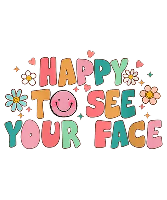 See allThis cheerful DTF transfer features the phrase 'HAPPY TO SEE YOUR FACE' in a bubbly, retro font, adorned with charming cartoon flowers, twinkling stars, and an adorable smiley face. The vibrant pastel colors evoke a groovy 70s and 80s aesthetic, bringing a wave of positive vibes wherever it's applied. It's a fantastic ready to press design that instantly brightens any garment with its friendly and inviting message. Perfect for anyone who loves vintage style, spreading kindness, or just wants to make someone smile, this iron on transfer is ideal for small business owners creating unique apparel or individuals personalizing gifts. It’s a wonderful choice for everyday wear, friendly gatherings, or as a thoughtful present for a best friend, teacher, or family member. This delightful heat transfer design makes a great statement piece, radiating warmth and happiness. Applying this heat press transfer is simple and yields professional results. It works beautifully on a wide range of materials including cotton, polyester, cotton-poly blends, and even nylon. Just use a heat press at 300-325°F for 15 seconds with medium pressure, or apply with a household iron. There’s no tedious weeding required – just peel and press! Create custom t-shirts, hoodies, sweatshirts, tote bags, pillow covers, baby onesies, aprons, and denim jackets. For lasting durability, wash garments inside out and tumble dry low. Experience superior quality with this ready to press transfer. It boasts vibrant, full-color printing with exceptional fine detail and smooth gradients that truly pop. The design is crack-resistant and soft to the touch, providing a comfortable feel without the heavy, rigid texture of traditional vinyl. Each direct to film transfer is printed on premium DTF film with a strong adhesive backing, ensuring a professional and long-lasting application every time.