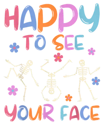 See allThis delightful DTF transfer brings a playful twist to spooky season, perfect for spreading smiles. Featuring the bubbly, colorful text "HAPPY TO SEE YOUR FACE" alongside three adorably cheerful skeletons striking various poses—one dancing, one doing a handstand, and another waving—this design is bursting with personality. Scattered pastel flowers add a touch of whimsical charm, making this a truly unique and ready to press design that’s fun for all ages. This design is a fantastic iron on transfer for crafters, small t-shirt businesses, and anyone looking to create custom apparel with a quirky, lighthearted touch. It's ideal for creating cute Halloween outfits that aren't too scary, perfect for school events, fall festivals, or everyday wear for those who love a bit of playful gothic charm. Whether you’re making gifts for friends, family, or adding unique inventory to your boutique, this heat transfer design is sure to be a hit with its vibrant colors and engaging scene. Applying this heat press transfer is simple and efficient. It works beautifully on a wide variety of fabrics including cotton, polyester, cotton-poly blends, and even nylon, ensuring versatility for your projects. Just use a heat press at 300-325°F for 15 seconds with medium pressure, or apply with a household iron. No tedious weeding is required – simply peel and press! It's perfect for custom t-shirts, hoodies, sweatshirts, tote bags, pillow covers, baby onesies, aprons, and denim jackets. For lasting durability, wash garments inside out and tumble dry on low. Each ready to press transfer guarantees vibrant, full-color printing with exceptional fine detail, ensuring your designs pop. The print is crack-resistant and soft to the touch, without the heavy, stiff feel often associated with vinyl transfers. Crafted on premium DTF film with a strong adhesive backing, every direct to film transfer provides professional-grade results that stand up to wear and washing, making your creations look fantastic every time.