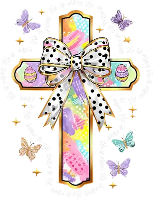 See allThis captivating DTF transfer celebrates the joy and renewal of Easter with a stunning and vibrant design. It showcases a beautifully detailed cross filled with a lively watercolor pattern in pastel pink, purple, yellow, and blue hues, accented with a classic white and black polka dot bow and elegant golden outlines. Decorated Easter eggs adorn the cross arms, while colorful butterflies flutter gracefully around the central 'He is risen' message, subtly repeated in a circular pattern. This eye-catching design is a ready to press transfer, perfect for adding a touch of faith and spring cheer to any garment. This delightful iron on transfer is perfect for Christian women, families celebrating Easter, and anyone looking to express their faith with style. It’s an ideal heat transfer design for creating custom apparel for Easter Sunday services, church events, Sunday school groups, or as thoughtful gifts for friends and loved ones. Small t-shirt businesses and crafters will appreciate the vibrant colors and detailed artistry, making it easy to create unique, sellable merchandise that stands out during the spring season. Applying this heat press transfer is simple and efficient, requiring no weeding or complex steps. It works beautifully on a wide variety of materials, including cotton, polyester, cotton-poly blends, and even nylon. For best results, apply with a heat press at 300-325°F for 15 seconds with medium pressure, or use a household iron with firm, even pressure. Transform custom t-shirts, cozy hoodies, stylish tote bags, baby onesies, aprons, or denim jackets into personalized masterpieces. To ensure lasting durability, wash garments inside out and tumble dry low. Our ready to press transfer ensures vibrant, full-color printing with exceptional detail, capturing every brushstroke and delicate butterfly wing. The result is a crack-resistant, soft-to-the-touch finish that lacks the heavy feel of traditional vinyl. Each direct to film transfer is produced using premium DTF film and high-quality inks, featuring a strong adhesive backing for professional-grade application and a truly durable, stunning outcome every single time.