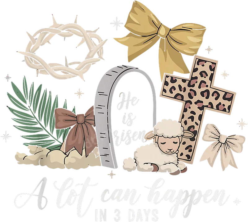 See allThis captivating 'He Is Risen' DTF transfer beautifully commemorates the Easter story with powerful imagery. Featuring a rugged crown of thorns, an open tombstone proclaiming 'He is risen,' a stylish leopard print cross, a gentle lamb, and palm leaves, the design is anchored by the inspiring message, 'A lot can happen in 3 days.' This vibrant direct to film transfer is perfect for expressing your faith, making it a perfect ready to press transfer for your faith-inspired apparel or accessories. Ideal for Christians, church members, and families celebrating the holiday, this design is perfect for Easter Sunday, Lent, or any spiritual gathering. It’s an ideal iron on transfer for personalizing gifts for fellow believers, creating matching church group shirts, or adding a meaningful touch to your spring wardrobe. Share the message of hope and resurrection with this unique and heartfelt design. Applying this transfer is simple and professional. Our high-quality heat transfer works flawlessly on a variety of fabrics including cotton, polyester, and blends. For best results, use a heat press at 300-325°F for 15 seconds with medium pressure, then cold peel. A household iron can also be used with careful application. Best of all, there's no weeding required, saving you time and effort. Crafted from premium DTF film, this heat press design offers exceptional durability, vibrant colors that pop, and a soft, flexible feel that won't crack or fade. The strong adhesive ensures your design stays put, providing a long-lasting, professional finish that stands up to countless washes. Elevate your garments with this beautiful and meaningful apparel transfer.