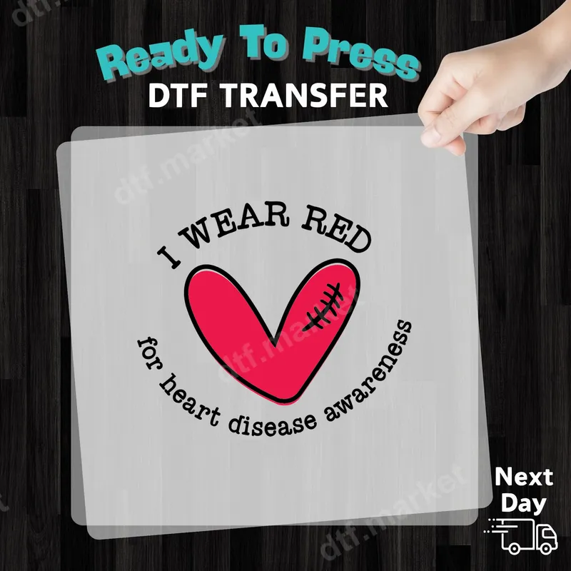 See allThis impactful "I WEAR RED for heart disease awareness" DTF transfer features a bold red heart with a symbolic stitch detail, encircled by empowering text. It's a powerful statement piece designed to raise awareness and show solidarity for those affected by heart disease. This high-quality direct to film transfer is ready to press onto your favorite apparel, offering a seamless and vibrant application experience. Ideal for heart health advocates, survivors, family members, medical professionals, or anyone wanting to support the cause. This versatile design makes a thoughtful gift for Heart Health Month in February, charity walks, awareness events, or daily wear to spread an important message. Create custom t-shirts, sweatshirts, or tote bags to honor loved ones and contribute to the awareness movement. Our premium heat press transfer is incredibly easy to apply, compatible with cotton, polyester, and various fabric blends. For best results, use a heat press at 300-325°F for 15 seconds with medium pressure, followed by a cold peel. No need for tedious weeding, making your customization process quick and efficient. You can even use a household iron for smaller projects, making this iron on transfer accessible for everyone. Experience superior quality with every heat press design. Our DTF transfers are known for their vibrant colors, exceptional durability, and soft-to-touch finish that resists cracking and fading after multiple washes. Crafted with professional-grade DTF film and a strong adhesive, these apparel transfers ensure your message stays clear and bold for years to come.