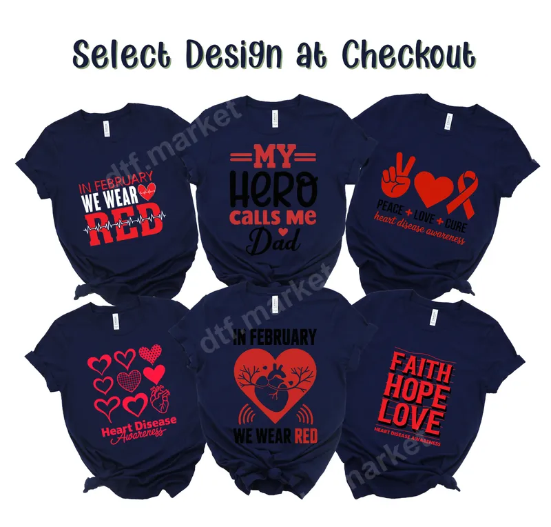 See allAdvocate for heart health with our vibrant Heart Disease Awareness DTF transfers, perfect for National Wear Red Day in February and year-round support. This versatile collection features impactful messages like 'In February We Wear Red,' 'Peace Love Cure,' and 'Faith Hope Love,' alongside designs with anatomical hearts, red ribbons, and decorative heart motifs. We also offer a special 'My Hero Calls Me Dad' option. Each ready to press transfer uses bold typography and graphics to effectively convey your message. These high-quality heat transfers are ideal for individuals passionate about heart health awareness: survivors, family, caregivers, and medical professionals. They make meaningful gifts for loved ones, group events, fundraising efforts, and community walks dedicated to cardiovascular health. Whether creating custom shirts for an awareness campaign or personalizing your attire, these designs provide a powerful way to show solidarity. The 'My Hero Calls Me Dad' iron on transfer adds a loving touch for fathers. Our direct to film transfers are compatible with a wide array of fabrics, including cotton, polyester, and blends. Application is straightforward: use a heat press at 300-325°F for 15 seconds with medium pressure, then cold peel. A household iron can also be utilized for convenience. Enjoy a hassle-free process with no weeding or complex layering required, ensuring professional-grade results from these apparel transfers. Discover the premium quality of our DTF transfers. Each design showcases vibrant colors and crisp details that truly stand out. Crafted from professional-grade DTF film, these transfers offer a soft, flexible feel, resisting cracks and peels even after many washes. The strong adhesive guarantees a long-lasting bond, providing durable and professional outcomes. Create stylish apparel that not only looks fantastic but also amplifies an important message.