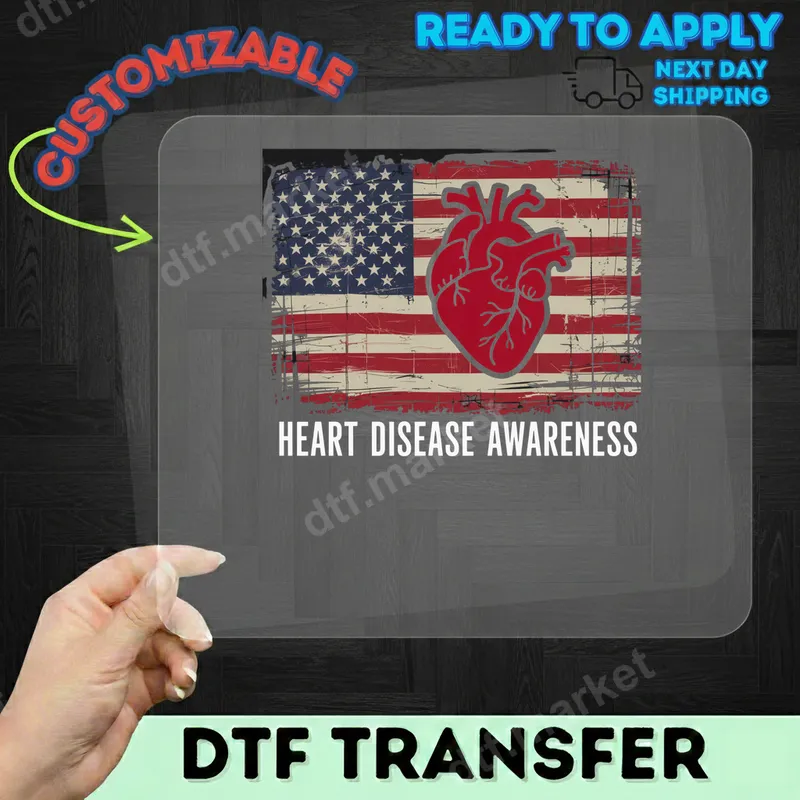 See allThe design showcases a powerful message of Heart Disease Awareness, set against a beautifully distressed American flag background. A prominent red anatomical heart graphic overlays the flag, making a bold statement. This high-quality DTF transfer is an ideal way to personalize apparel, arriving ready to press onto your chosen garment. This impactful design is perfect for medical professionals, heart disease survivors, advocates, and their supportive families and friends. Wear it during awareness walks, health campaigns, or simply to show your dedication year-round. It makes a thoughtful and unique gift for anyone passionate about cardiovascular health and patriotism. Applying this ready to press transfer is simple and efficient. It adheres flawlessly to a wide range of fabrics, including cotton, polyester, and various blends. For best results, use a heat press at 300-325°F for 15 seconds with medium, even pressure. A household iron can also be used with careful application. Enjoy the convenience of a vivid heat press design with no intricate weeding required. Expect superior quality with every DTF transfer. Our direct to film transfers boast incredibly vibrant colors that stand out, along with excellent durability, resisting cracks and peels even after many washes. The finish is soft to the touch, ensuring comfortable wear. Crafted from professional DTF film with a strong, reliable adhesive, your apparel transfer will look fantastic for a long time.